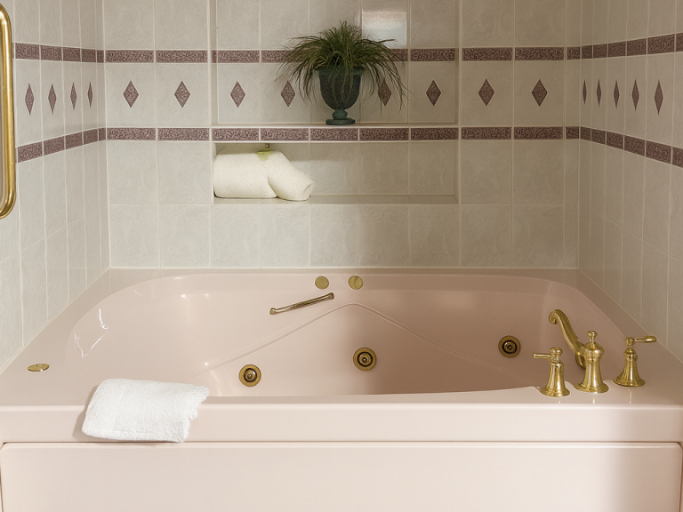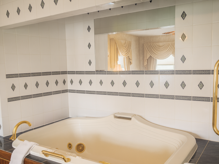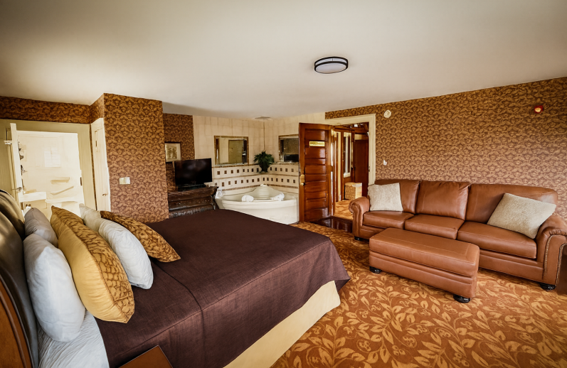 Immerse yourself into tranquility. This large suite offers a king size brass etched bed, fireplace, and two person jacuzzi tub. The on-suite bath features a shower and whirlpool combination.