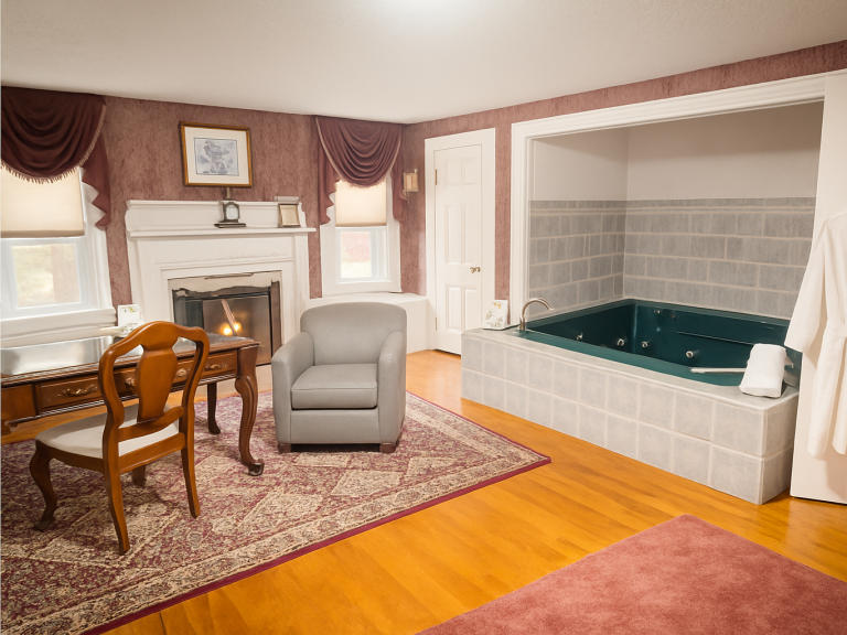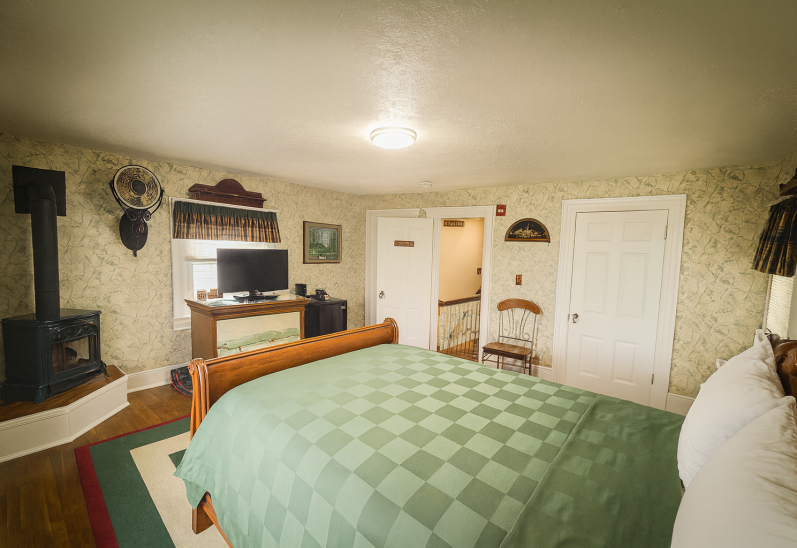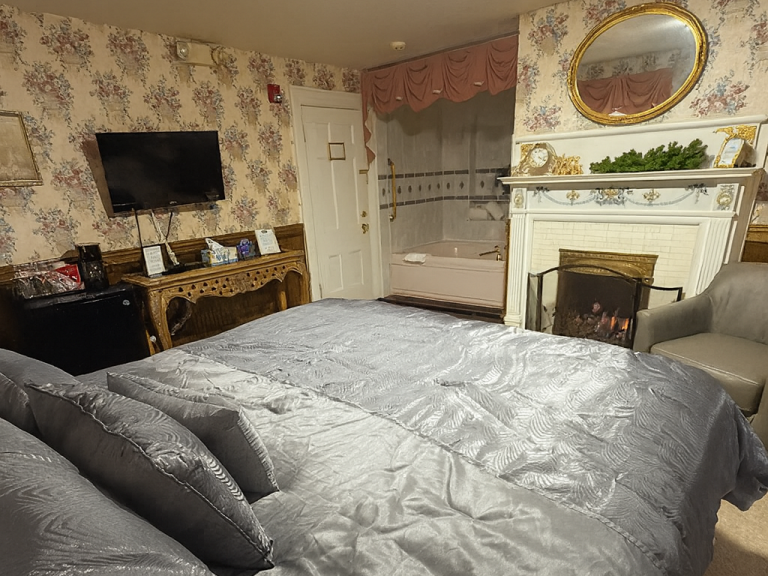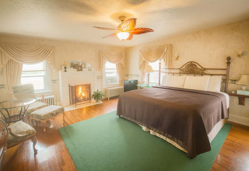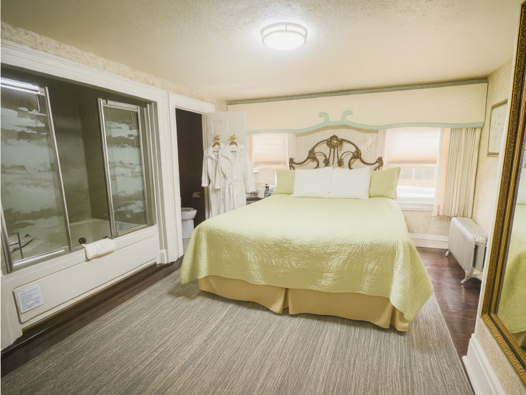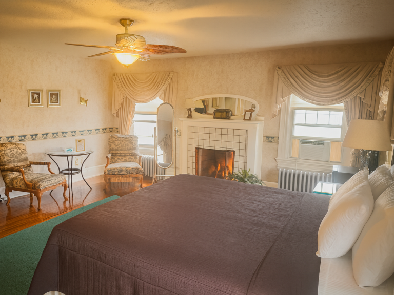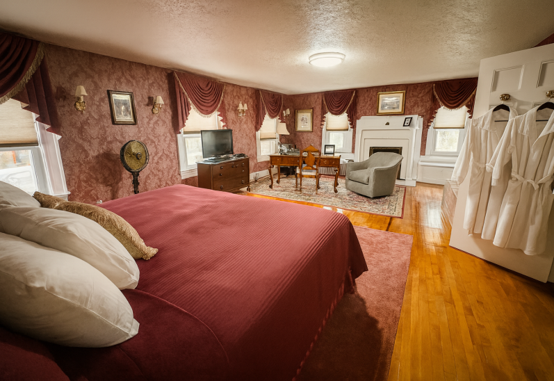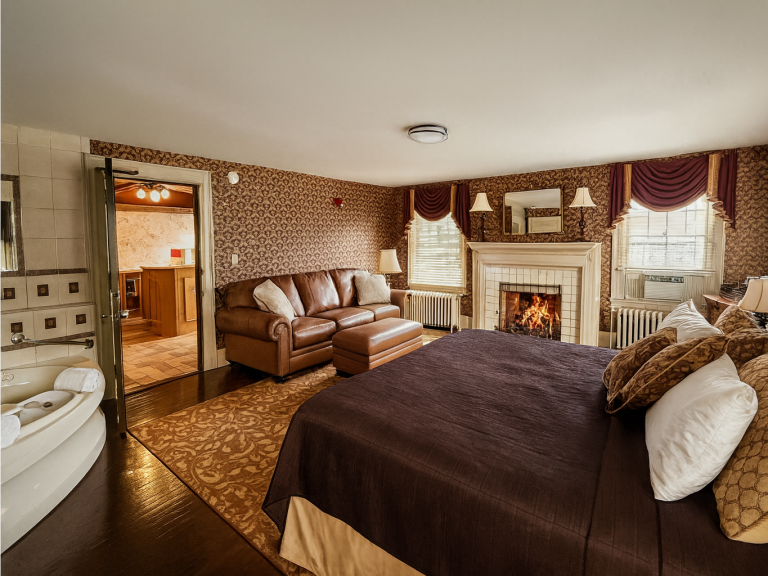 A room fit for a king. This first floor suite offers a king size sleigh bed, fireplace, two person jacuzzi tub and a full size sofa. The on-suite bath features an 1800s marble shower with body sprays.