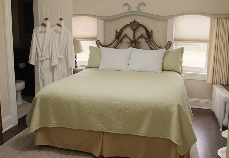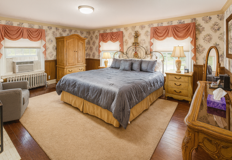 Quaint and comfortable. This room features a king size victorian style bed with a steel frame, a